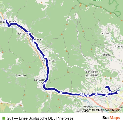 The first stop of the 281 bus route is Pinerolo - Centro Studi and the last stop is Perosa Argentina - Piazza Terzo Alpini. 281 (Linee Scolastiche DEL Pinerolese) is operational during everyday.