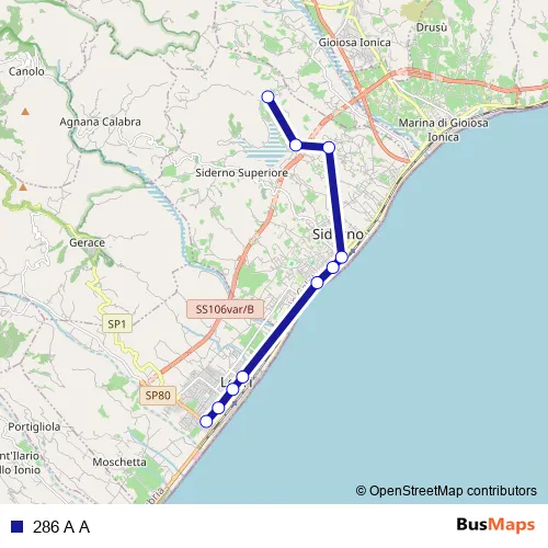 The first stop of the 286 A A bus route is Via Giacomo Matteotti, 408 - Locri and the last stop is Contrada Ferraro (Ponte Grande) - Siderno. 286 A A is operational during everyday.