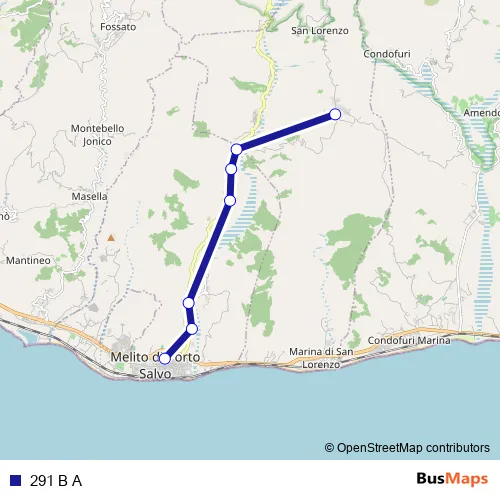 The first stop of the 291 B A bus route is Strada Comunale Ammendolara, 43 - San Lorenzo and the last stop is Via della Libertà - Melito di Porto Salvo. 291 B A is operational during everyday.