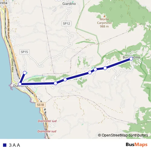 The first stop of the 3 A A bus route is Via Panoramica, 79 - Diamante and the last stop is Via Vittoria, 29 - Buonvicino. 3 A A is operational during everyday.