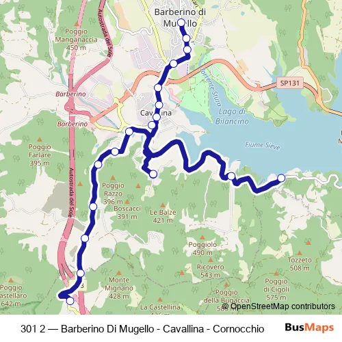 The first stop of the 301 2 bus route is Lo Smorto V and the last stop is Barberino Centro Cavour *. 301 2 (Barberino Di Mugello - Cavallina - Cornocchio) is operational during on weekdays.