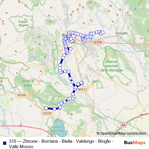 The first stop of the 310 bus route is Piverone Piazza Lucca and the last stop is Valdengo Piazza A.Rivetti (Fr.Municipio). 310 (Zimone - Borriana - Biella - Valdengo - Bioglio - Valle Mosso) is operational during everyday.