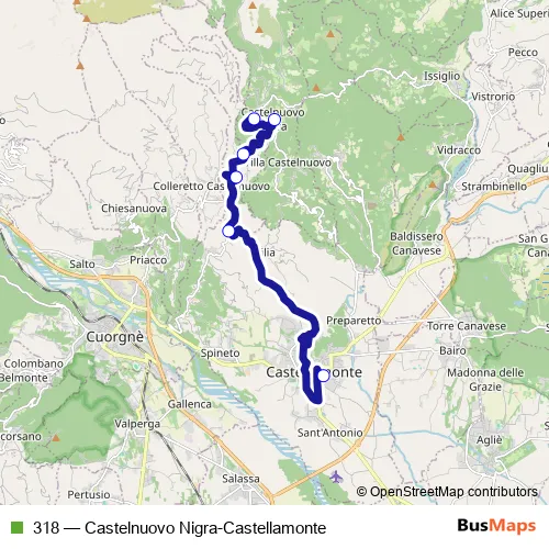 The first stop of the 318 bus route is Castellamonte - Stazione Ferroviaria and the last stop is Castelnuovo Nigra. 318 (Castelnuovo Nigra-Castellamonte) is operational during on weekdays.