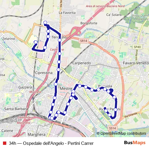 The first stop of the 34h bus route is Ospedale dell'Angelo and the last stop is Pertini Carrer. 34h (Ospedale dell'Angelo - Pertini Carrer) is operational during everyday.