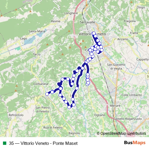 The first stop of the 35 bus route is P. Medaglie D'ORO B and the last stop is Vittorio Autostazione. 35 (Vittorio Veneto - Ponte Maset) is operational during everyday.