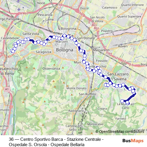 The first stop of the 36 bus route is Ospedale Bellaria and the last stop is Naldi. 36 (Centro Sportivo Barca - Stazione Centrale - Ospedale S. Orsola - Ospedale Bellaria) is operational during everyday.