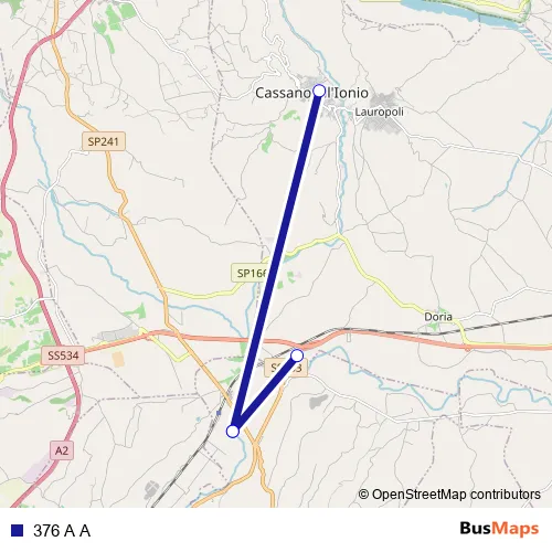 The first stop of the 376 A A bus route is Strada Statale 534 di Cammarata e degli Stombi - Castrovillari and the last stop is Strada Statale 19 delle Calabrie, 2 - Cassano all'Ionio. 376 A A is operational during everyday.