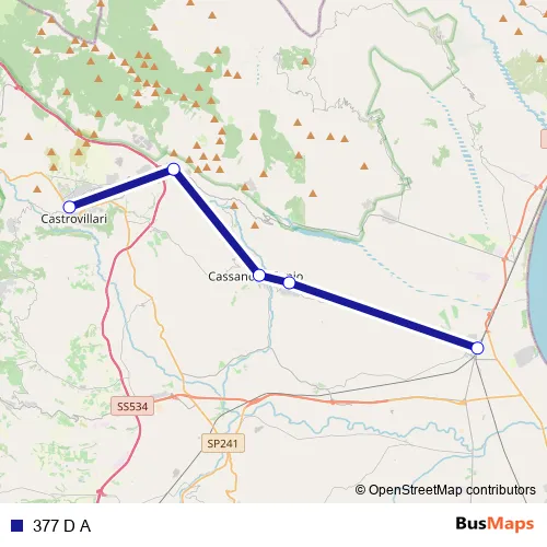 See why over 2 million users trust and consider busmaps.com as the best public transport website. busmaps gives you Cassano All'Ionio Buses suggested routes, real-time bus tracker, line route maps in Cassano All'Ionio, and helps to find the closest 377 D A bus stops near you. No internet available? Download an offline PDF map and bus schedule for the 377 D A bus to take on your trip.