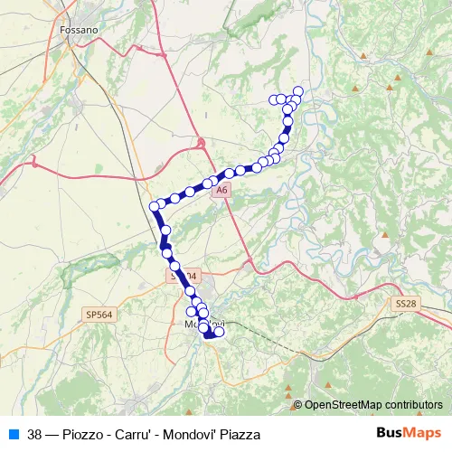 The first stop of the 38 bus route is Piozzo - Piazza Municipio and the last stop is Mondovi' - Municipio Breo. 38 (Piozzo - Carru' - Mondovi' Piazza) is operational during everyday.