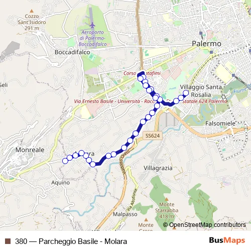 The first stop of the 380 bus route is Parcheggio Basile Corsia Esterna and the last stop is Corpo DI Guardia. 380 (Parcheggio Basile - Molara) is operational during everyday.