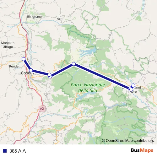 The first stop of the 385 A A bus route is Viale della Repubblica, 45 - San Giovanni In Fiore and the last stop is Stazione Ferroviaria di Cosenza - Cosenza. 385 A A is operational during everyday.