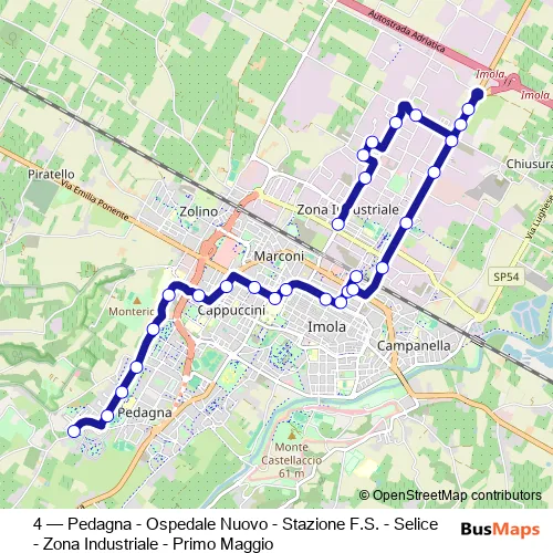 The first stop of the 4 bus route is Dalla Chiesa and the last stop is Primo Maggio. 4 (Pedagna - Ospedale Nuovo - Stazione F.S. - Selice - Zona Industriale - Primo Maggio) is operational during everyday.