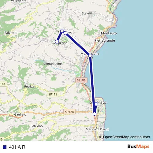 The first stop of the 401 A R bus route is Via Trento Trieste, 96 - Soverato and the last stop is Via A. Gramsci, 59 - Gasperina. 401 A R is operational during everyday.