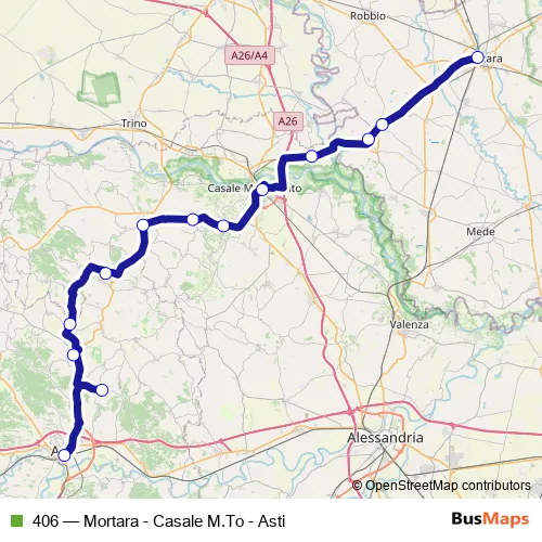 The first stop of the 406 bus route is Asti - Autostazione - Movicentro - Piazzale Medaglie D'Oro and the last stop is Mortara - Stazione Ferroviaria. 406 (Mortara - Casale M.To - Asti) is operational during everyday.