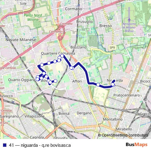 The first stop of the 41 bus route is via giovanni d'anzi and the last stop is q.re bovisasca. 41 (niguarda - q.re bovisasca) is operational during on weekends.
