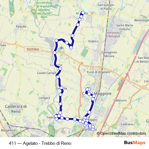 The first stop of the 411 bus route is Castel Maggiore Neruda and the last stop is Argelato. 411 (Agelato - Trebbo di Reno) is operational during everyday.