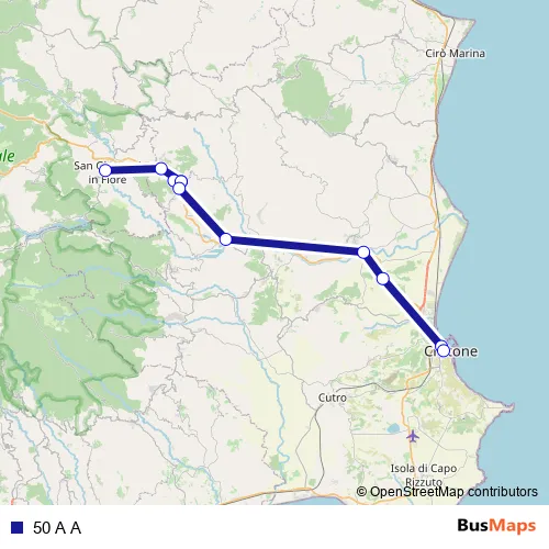 The first stop of the 50 A A bus route is Via Roma, 93 - San Giovanni in Fiore and the last stop is Via G.Paolo II - Crotone. 50 A A is operational during everyday.