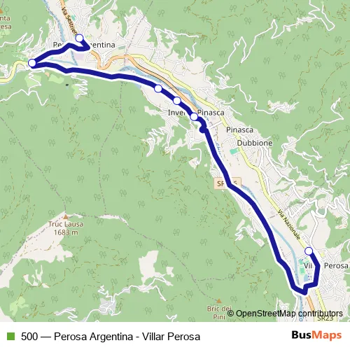 The first stop of the 500 bus route is Perosa Argentina - Piazza Terzo Alpini and the last stop is Villar Perosa - SKF - VIA Nazionale Angolo VIA Alighieri. 500 (Perosa Argentina - Villar Perosa) is operational during everyday.