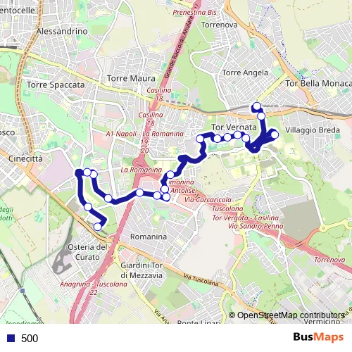 The first stop of the 500 bus route is Torre Angela (Mc) and the last stop is Anagnina (Ma). 500 is operational during everyday.