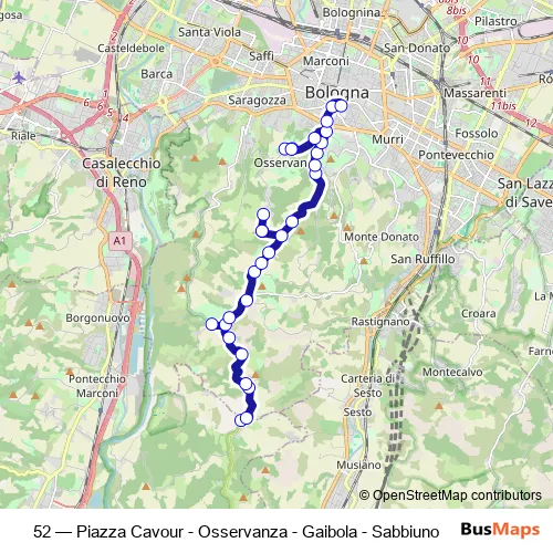 The first stop of the 52 bus route is Sabbiuno Casetta and the last stop is Piazza Cavour. 52 (Piazza Cavour - Osservanza - Gaibola - Sabbiuno) is operational during everyday.