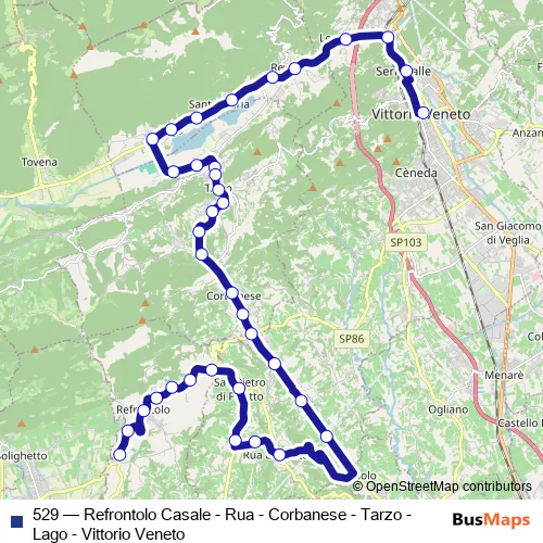 The first stop of the 529 bus route is P. Medaglie D'ORO A and the last stop is Refr. V. Casale. 529 (Refrontolo Casale - Rua - Corbanese - Tarzo - Lago - Vittorio Veneto) is operational during everyday.