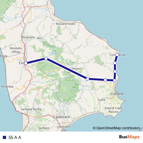 The first stop of the 55 A A bus route is Autostazione Cosenza - Cosenza and the last stop is Piazza Kennedy, 19 - Ciro Marina. 55 A A is operational during everyday.