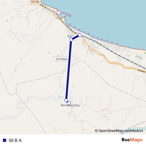 The first stop of the 58 B A bus route is Via San Venere, 1 - Terravecchia and the last stop is Strada Statale 106 Jonica, 24 - Cariati. 58 B A is operational during everyday.