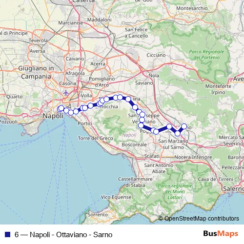 The first stop of the 6 rail route is Napoli Porta Nolana and the last stop is Sarno. 6 (Napoli - Ottaviano - Sarno) is operational during everyday.