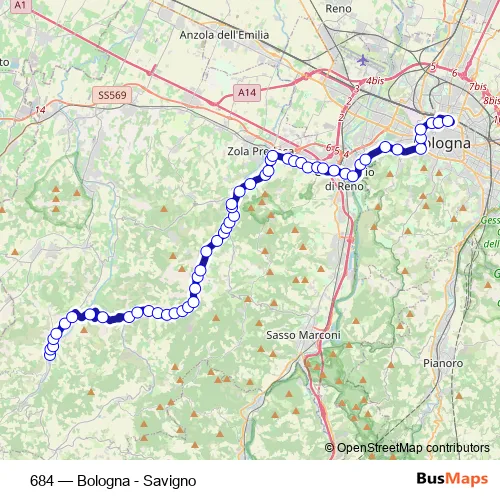The first stop of the 684 bus route is Savigno and the last stop is Bologna Autostazione. 684 (Bologna - Savigno) is operational during everyday.