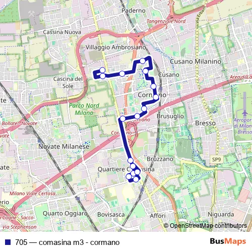 The first stop of the 705 bus route is cormano (via zara) and the last stop is via da novate via forni. 705 (comasina m3 - cormano) is operational during everyday.