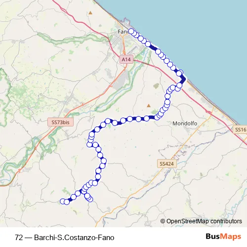 The first stop of the 72 bus route is Barchi 2 (Capolinea) and the last stop is Fano Stazione (Bus+Fs). 72 (Barchi-S.Costanzo-Fano) is operational during everyday.
