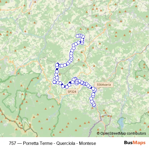 The first stop of the 757 bus route is Porretta Terminal and the last stop is Montese. 757 (Porretta Terme - Querciola - Montese) is operational during everyday.