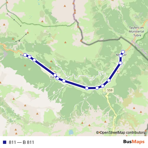 The first stop of the 811 bus route is Müstair, Clostra Son Jon and the last stop is Tschierv, Biosfera. 811 (B 811) is operational during everyday.