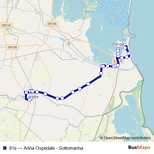 The first stop of the 81e bus route is Cavarzere and the last stop is Sottomarina. 81e (Adria Ospedale - Sottomarina) is operational during everyday.