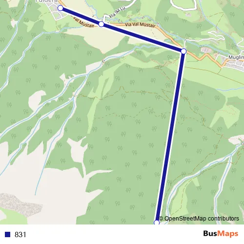 The first stop of the 831 bus route is Fuldera, cumün and the last stop is Sta. Maria Val M., Pra da Vau. 831 is operational during everyday.