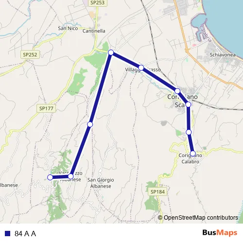 The first stop of the 84 A A bus route is Via Santuario, 180 - San cosmo albanese and the last stop is Via Margherita,54 - Corigliano Calabro. 84 A A is operational during everyday.
