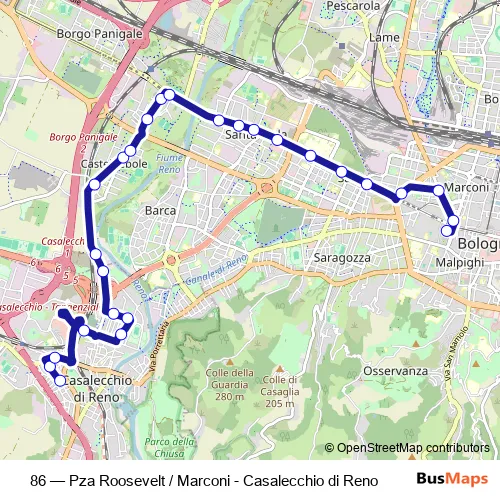 The first stop of the 86 bus route is Casalecchio Marullina and the last stop is Piazza SAN Francesco. 86 (Pza Roosevelt / Marconi - Casalecchio di Reno) is operational during everyday.
