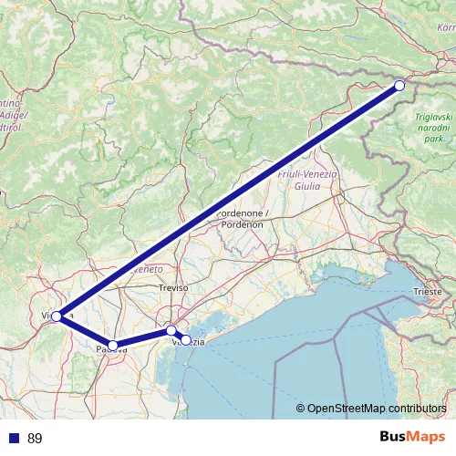 The first stop of the 89 rail route is Tarvisio Boscoverde and the last stop is