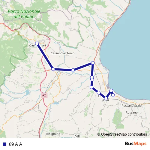 The first stop of the 89 A A bus route is Strada statale 106r, 35 - Corigliano Calabro and the last stop is Castrovillari Autostazione, Via degli Osci - Castrovillari. 89 A A is operational during everyday.