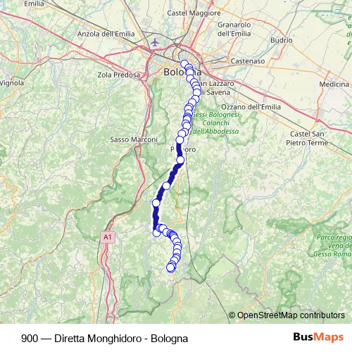 The first stop of the 900 bus route is Bologna Autostazione and the last stop is Monghidoro. 900 (Diretta Monghidoro - Bologna) is operational during on weekdays.