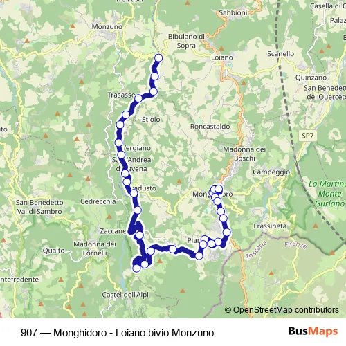 The first stop of the 907 bus route is Monghidoro and the last stop is Ponte Savena BV Monzuno. 907 (Monghidoro - Loiano bivio Monzuno) is operational during on weekdays.
