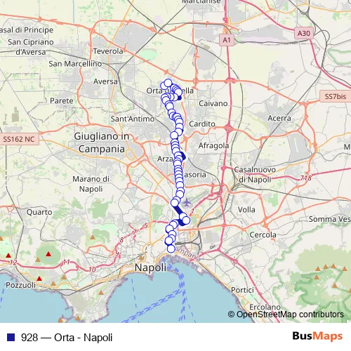 The first stop of the 928 bus route is Succivo - Via Caserta C/Linea and the last stop is Napoli - Porta Nolana Staz Eav. 928 (Orta - Napoli) is operational during everyday.