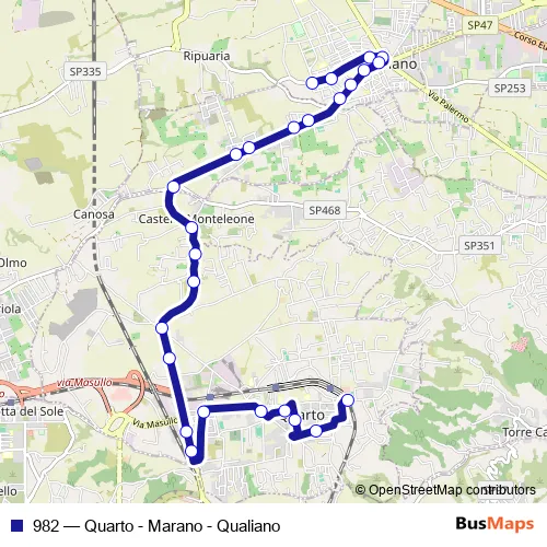The first stop of the 982 bus route is Qualiano - Capolinea Via G. Di Vittorio piazzetta and the last stop is Quarto - Via Santa Maria Cl. 982 (Quarto - Marano - Qualiano) is operational during everyday.