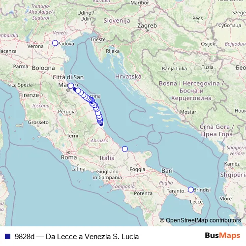 The first stop of the 9828d rail route is Brindisi and the last stop is Padova. 9828d (Da Lecce a Venezia S. Lucia) is operational during everyday.