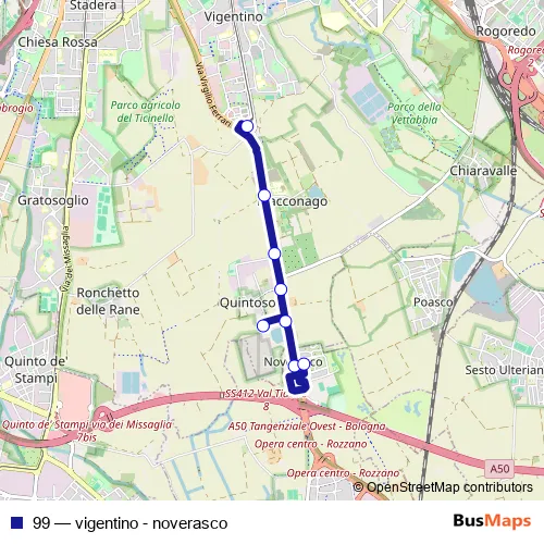 The first stop of the 99 bus route is vigentino and the last stop is noverasco (opera). 99 (vigentino - noverasco) is operational during everyday.