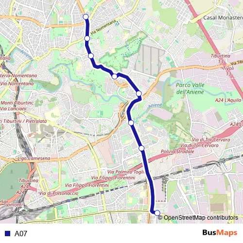 The first stop of the A07 bus route is Prenestina/Manfredonia and the last stop is Fucini/Davanzati. A07 is operational during everyday.