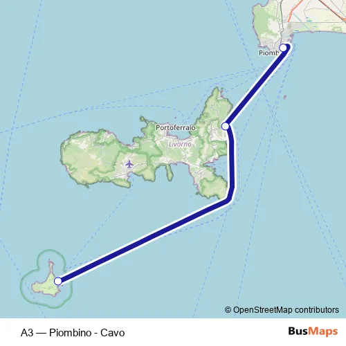 The first stop of the A3 ferry route is Piombino and the last stop is Isola Di Pianosa. A3 (Piombino - Cavo) is operational during everyday.