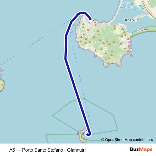 The first stop of the A5 ferry route is Isola Di Giannutri and the last stop is Porto S.Stefano. A5 (Porto Santo Stefano - Giannutri) is operational during everyday.