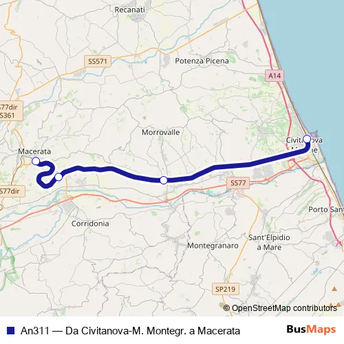 The first stop of the An311 rail route is Civitanova-M. Montegr. and the last stop is Macerata. An311 (Da Civitanova-M. Montegr. a Macerata) is operational during everyday.