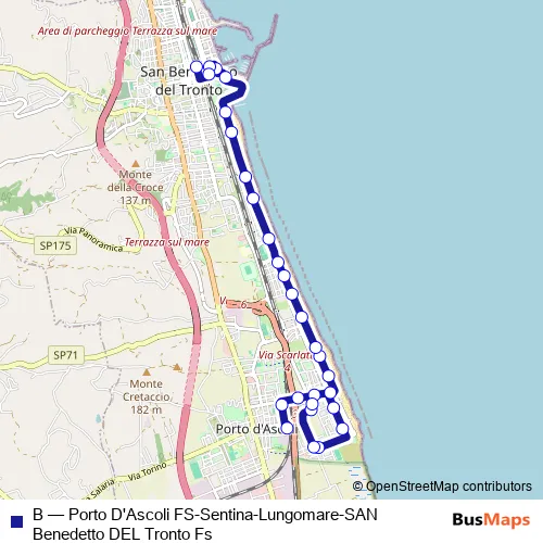 The first stop of the B bus route is Stazione DI Porto D'Ascoli and the last stop is S. Benedetto DEL TR. - Stazione Ffss. B (Porto D'Ascoli FS-Sentina-Lungomare-SAN Benedetto DEL Tronto Fs) is operational during everyday.